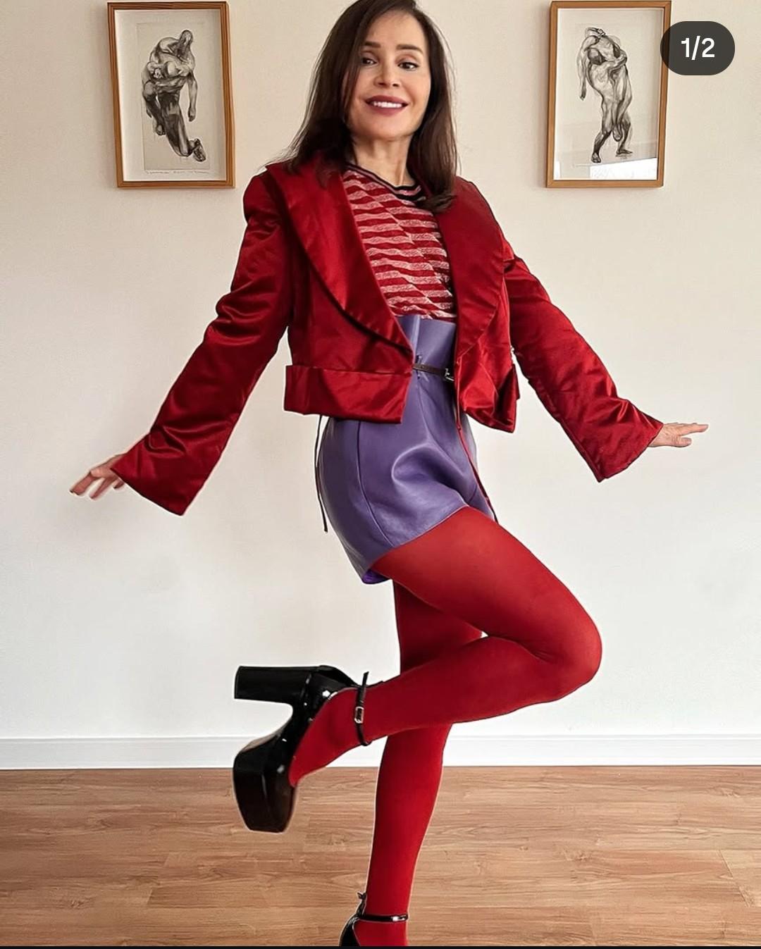 Флорин, която прехвърли 60-те, показа тяло, на което могат да завидят и най-младите й колежки. Популярната изпълнителка е съчетала кожената мини поличка в цвят лилав с ален топ и наситеночервен чорапогащник.