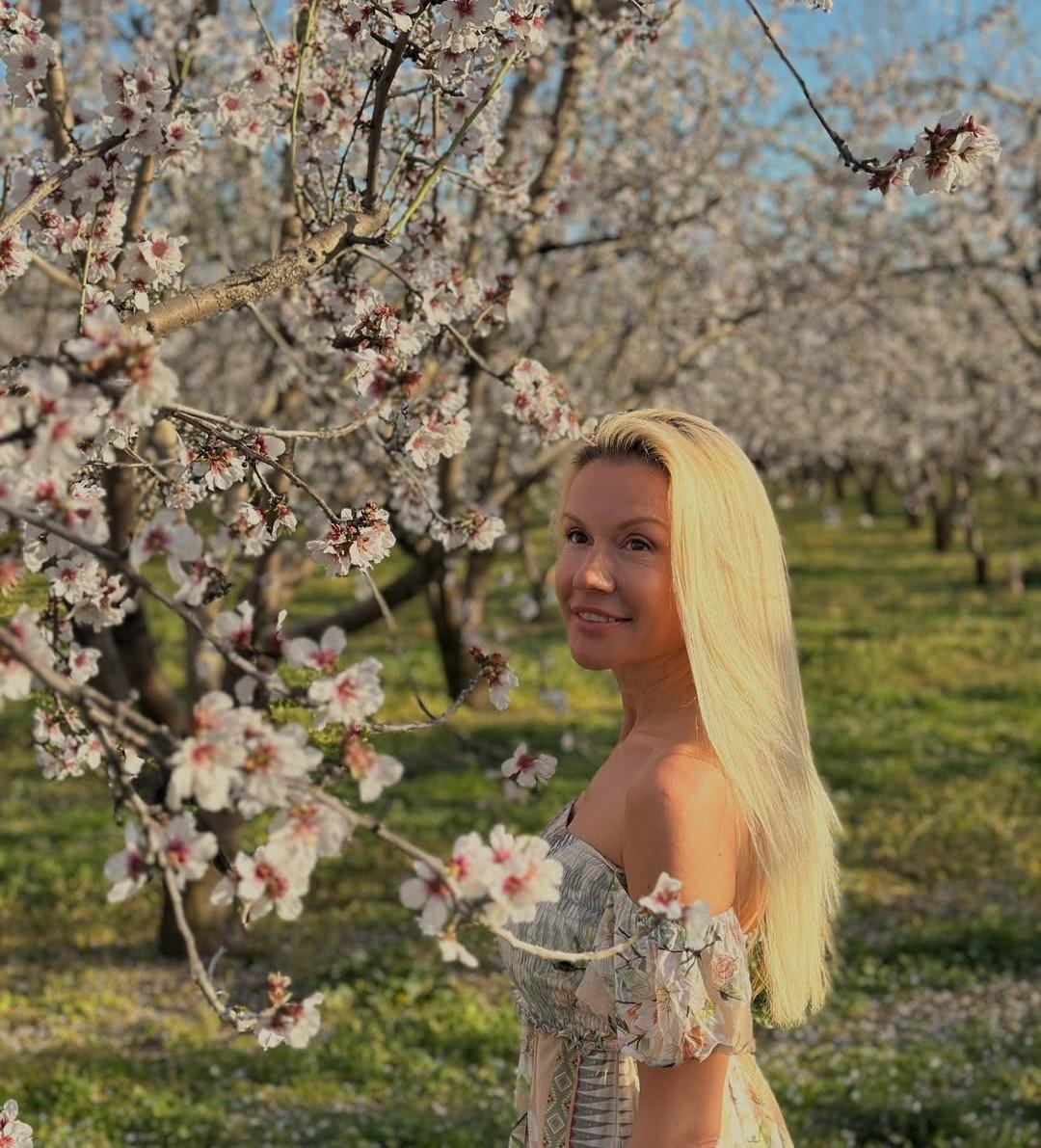 Бившата на Рачков приветства първите пролетни дни със снимки в овощна градина, където е заголила рамене и се радва на птичките, пчеличките и цветчетата по дръвчетата.
