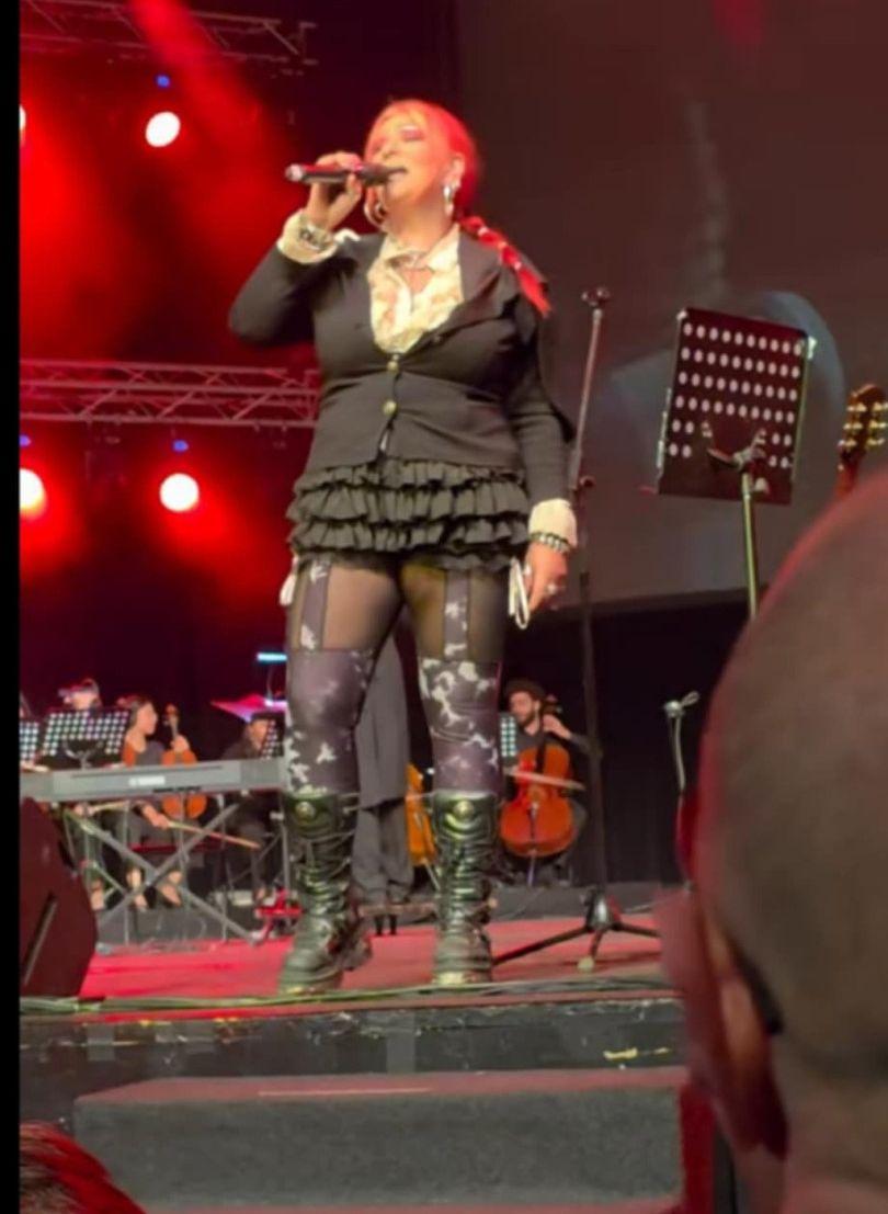 Певицата, позната с бунтарски дух и безкомпромисно отношение към клишетата, се появи на сцената в миниатюрна черна пола с къдрици, която по-скоро напомняше аксесоар, отколкото дреха. Върху нея – тясно сако, подчертаващо извивките и годините, тежки кубинки и несломимото самочувствие на жена, която не признава ограничения.
