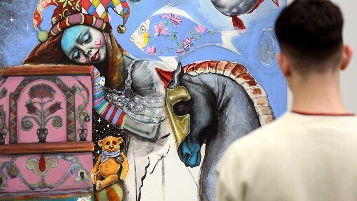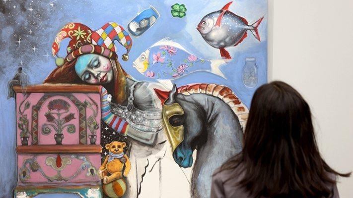 Млада почитателка на живописта гледа в захлас картина на Димитрова