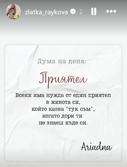 За първи път след скандалния арест на съпруга си Карен Хачатрян, Златка Райкова преговори в социалните мрежи, гръмна първи Intrigi.bg. След близо едноседмично мълчание, плеймейтката си позволи, макар и завоалирано, да отвори темата за ситуацията с мъжа й.