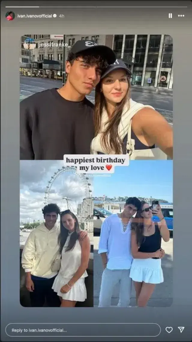 19-годишната хубавица сама показа кадри, на които двамата се прегръщат и целуват. Джесика изпраща куп сърца на Иван и се обръща към него с мили думи. Повод за това бе рожденият ден на спортиста. Шампионът от юношеските издания на „Уимбълдън“ и US Open навърши 17 години в четвъртък.