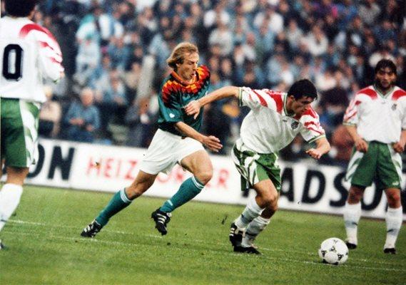 Петър Хубчев в борба за топката с нападателя на Германия Руди Фьолер