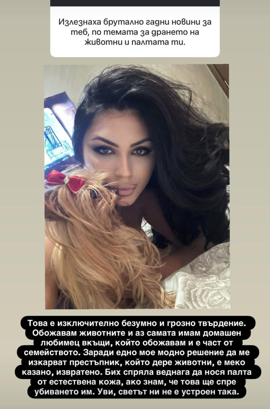 „Това е изключително безумно и грозно твърдение. Обожавам животните и аз самата имам домашен любимец вкъщи, който обожавам и е част от семейството“, написа Тафкова в Инстаграм, добавяйки снимка с кученцето си.