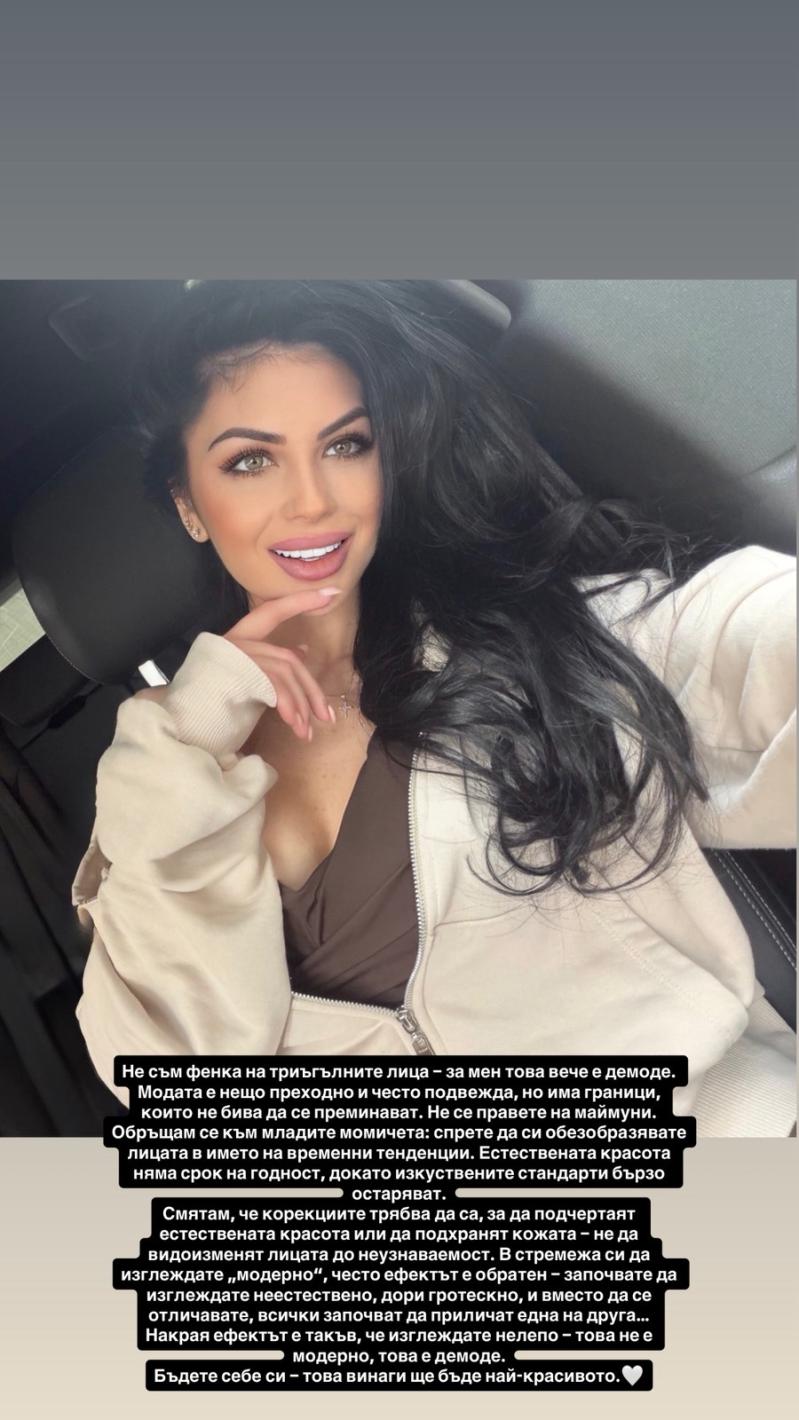 „Смятам, че корекциите трябва да са, за да подчертаят естествената красота или да подхранят кожата – не да видоизменят лицата до неузнаваемост. Така започвате да изглеждате неестествено, дори гротескно, и вместо да се отличавате, всички започвате да приличате една на друга…“, възмущава се Венцислава.