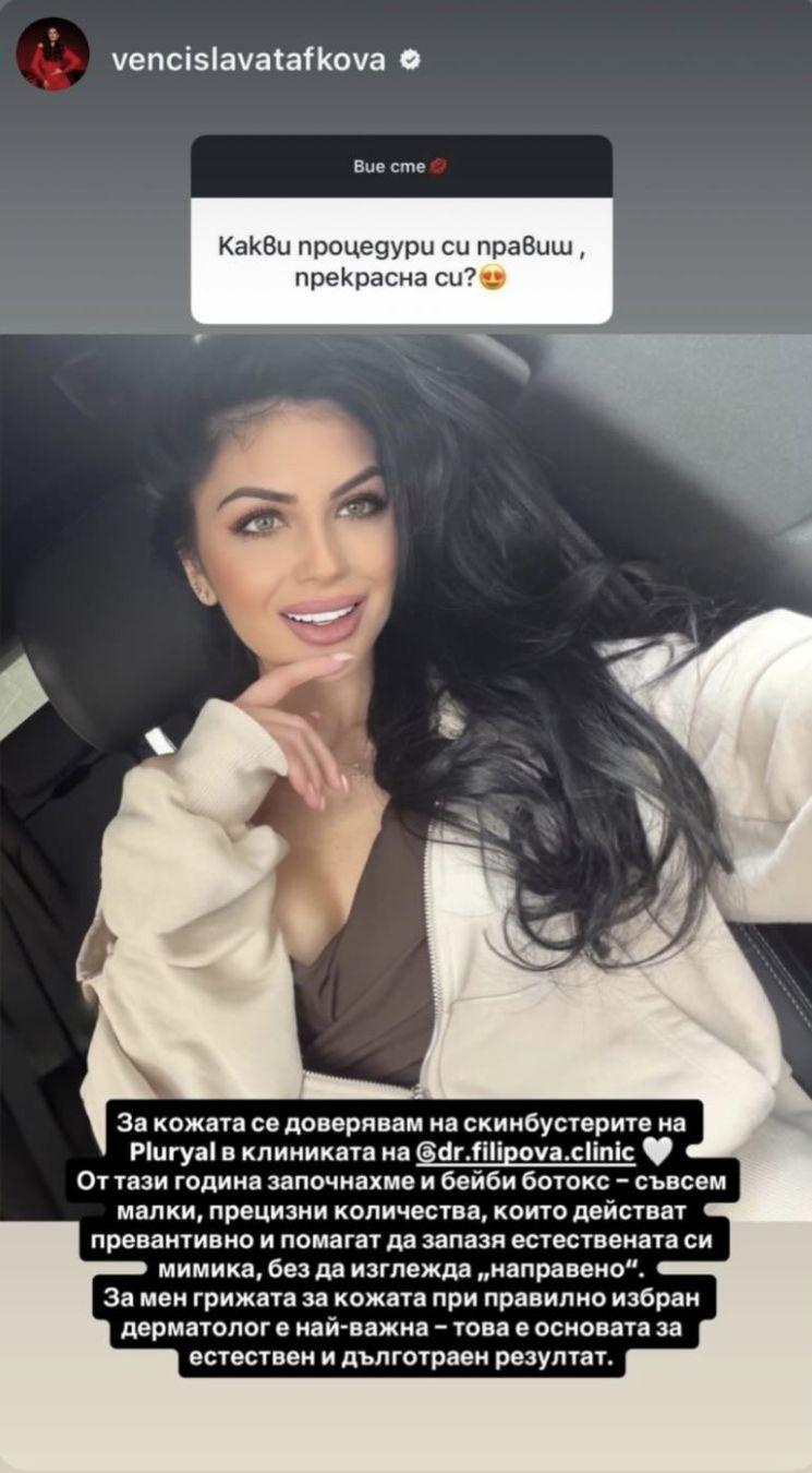 Мис България 2020 Венцислава Тафкова разкри как поддържа кожата си свежа, без да прибягва до тежки и обезличаващи корекции. Изгряващата фолк звезда сподели, че се доверява на скинбустери, а от тази година е започнала и бейби ботокс – процедура с минимални количества, която действа превантивно и запазва естествената мимика на лицето, пише Nie-jenite.