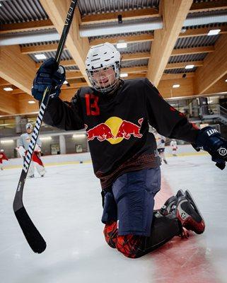 Заедно с други свои съотборници от академията на "Ред Бул" те гонят шайбата на ледената пързалка, оборудвани с подходяща екипировка, кънки и каски.
