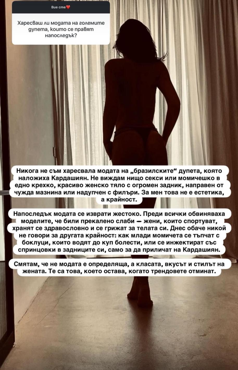 „Напоследък модата се изврати жестоко. Преди всички обвиняваха моделите, че били прекалено слаби — жени, които спортуват, хранят се здравословно и се грижат за телата си. Днес обаче никой не говори за другата крайност: как млади момичета се тъпчат с боклуци, които водят до куп болести, или се инжектират със спринцовки в задниците си, само за да приличат на Кардашиян“, недоумява една от най-популярните носителки на короната у нас.