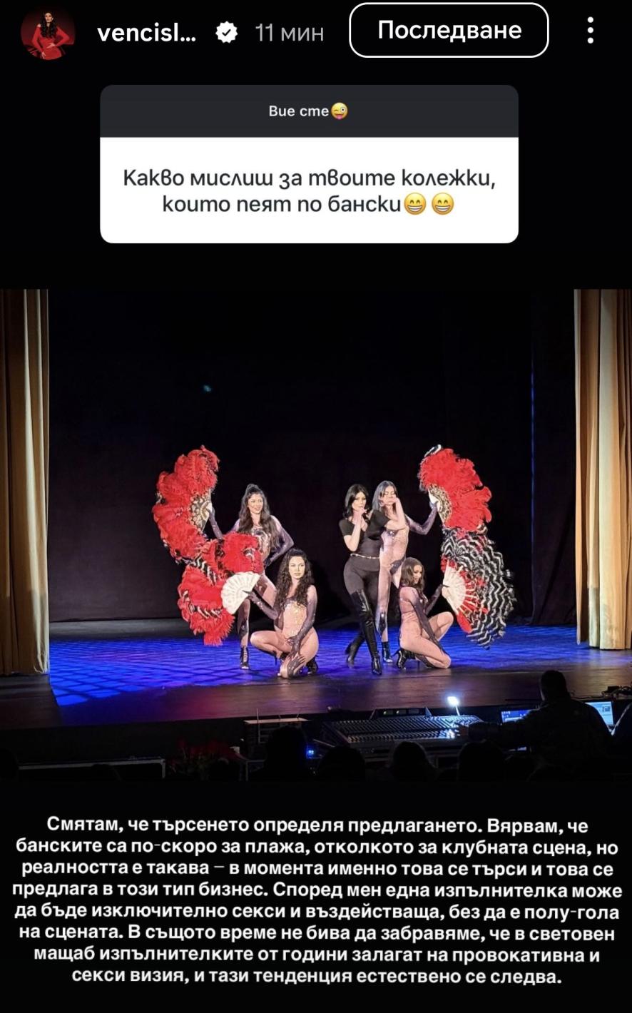 „Нека не забравяме, че в световен мащаб изпълнителките от години залагат на провокативна и секси визия, и тази тенденция естествено се следва“, заключва балансирано Венцислава.