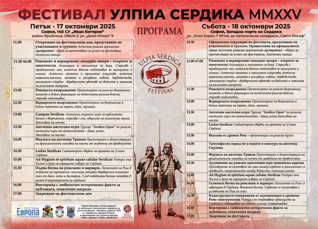 Готови ли сте за телепортация във времето? На 17 и 18 октомври 2025 г. жителите и гостите на София ще могат да се върнат 2000 години назад с фестивала „Улпия Сердика MMXXV“. Събитието ще се проведе на 17 октомври (петък) в 140. СОУ „Иван Богоров“ в Обеля и на 18 октомври (събота) на археологическия обект „Западната порта на Сердика“, в близост до католическата катедрала „Свети Йосиф“ и метростанция „Сердика“.