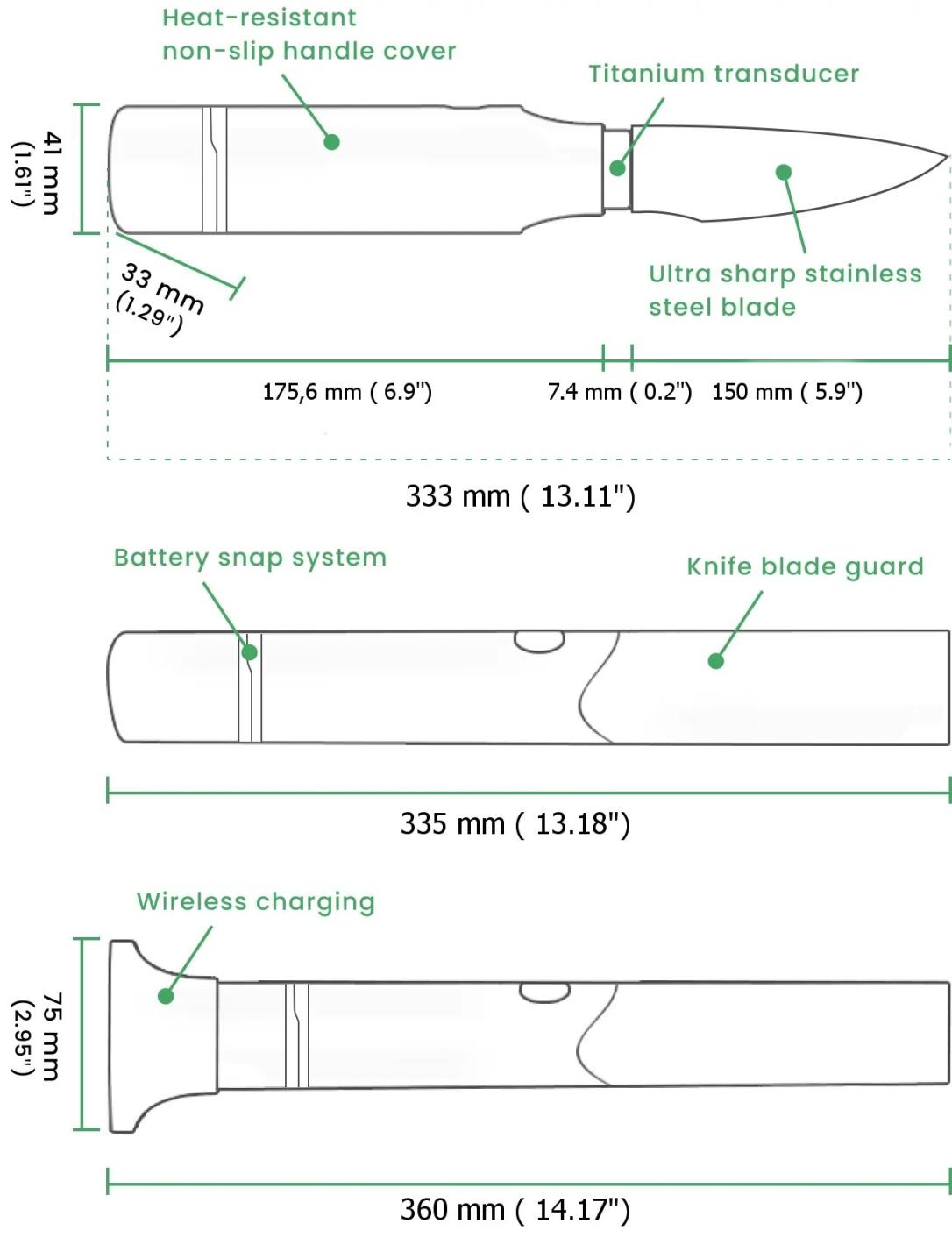 С ултразвукови вибрации, по-бързи от всяко човешко движение, ножът буквално реже сам от собствената си тежест.