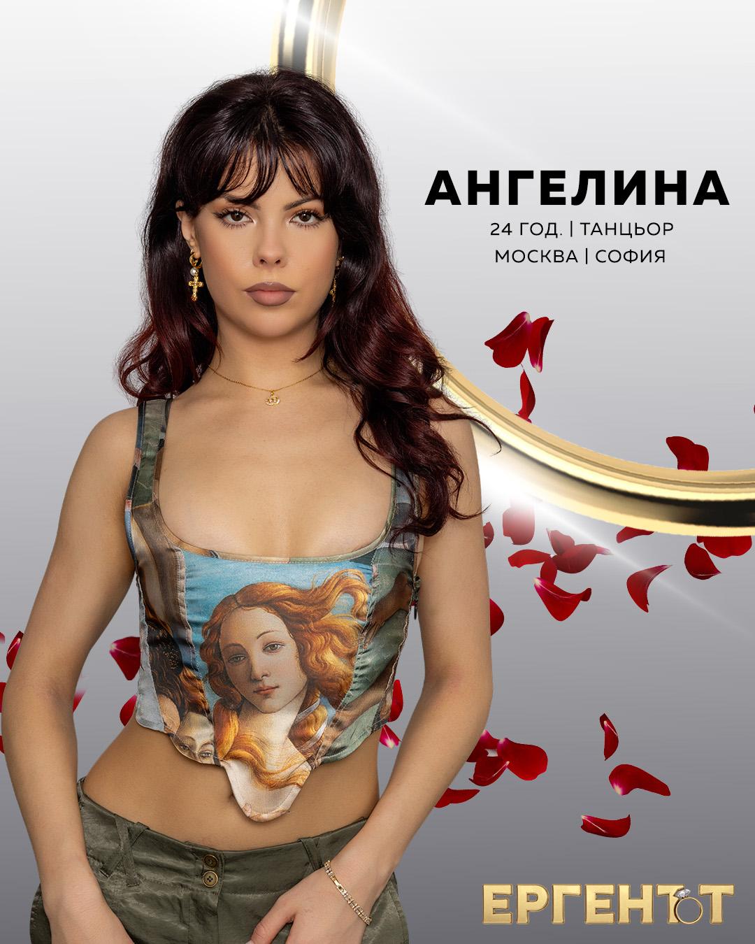 Ангелина е професионален танцьор. Рускиня по произход, тя се определя като жена без излишна злоба и ревност и вярва, че отношенията трябва да се градят върху уважение и спокойствие.
