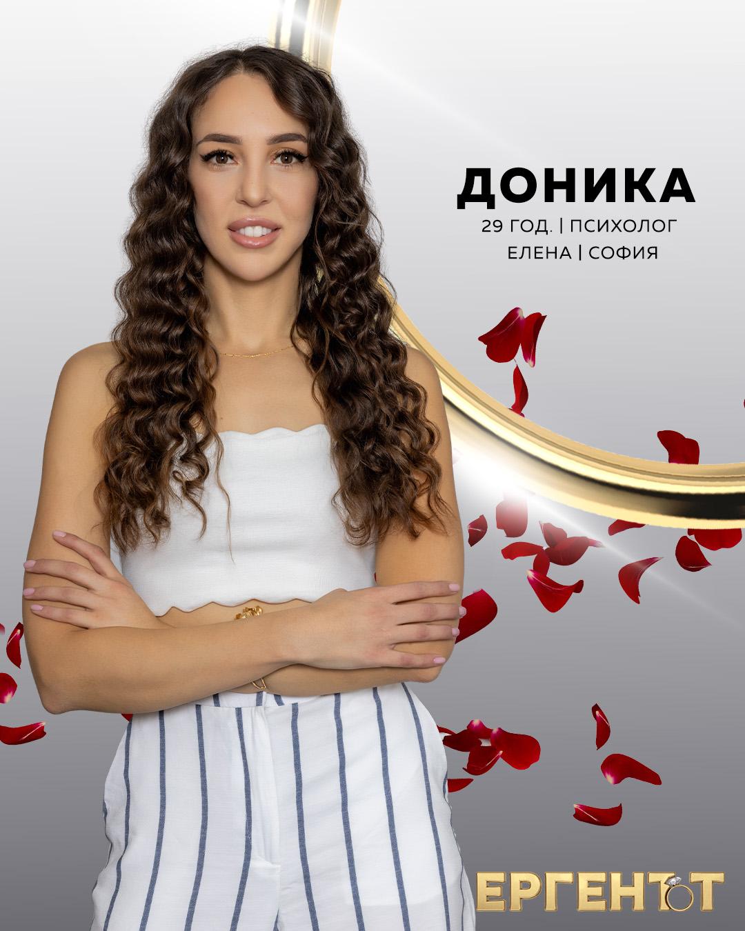 Доника влиза в „Ергенът" с фин подход и доза символика. По професия е психолог, а е в предаването за Крис и Стоян. Това я поставя в по-сложна позиция още от самото начало - ще следва ли сърцето си, или ще изчака да види накъде ще духне вятърът?