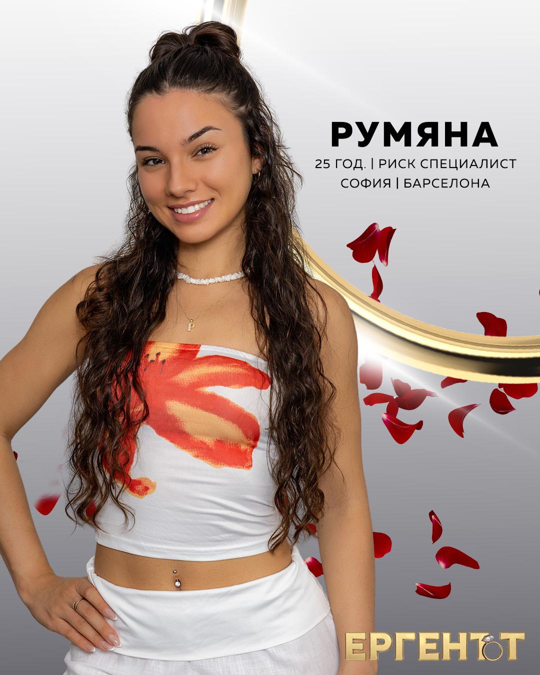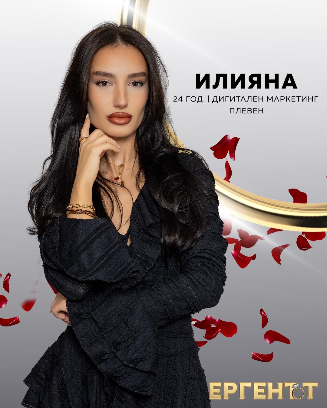 Илияна се занимава с дигитален маркетинг. До момента е имала само една сериозна връзка, която приключва преди две години - опит, който й помага да изясни какво търси оттук нататък. В „Ергенът“ влиза с ясни предпочитания - най-силно я привлича Стоян.